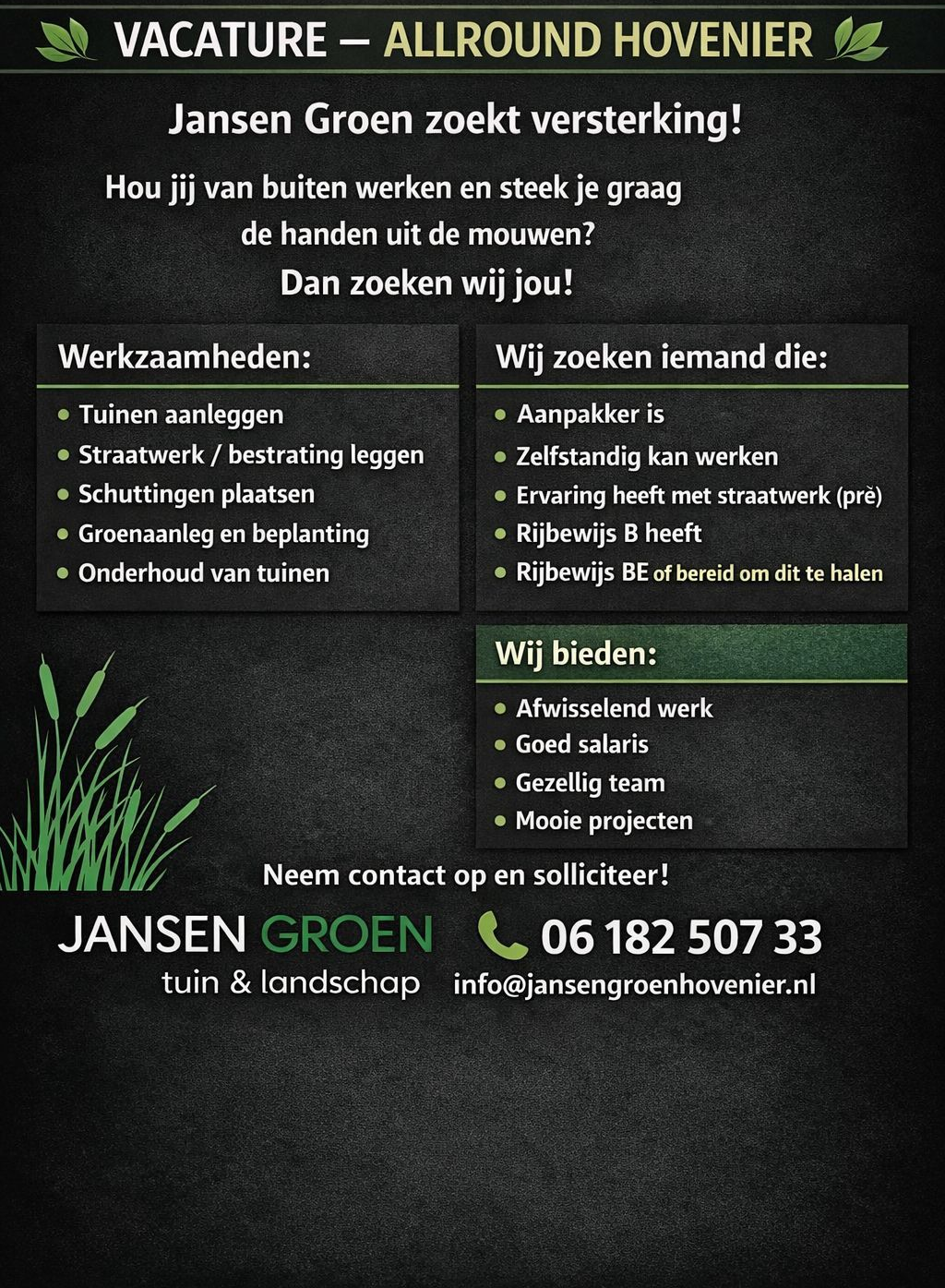 Bij Jansen Groen zijn wij nog op zoek naar de volgende stagelopers die het vak willen komen leren.